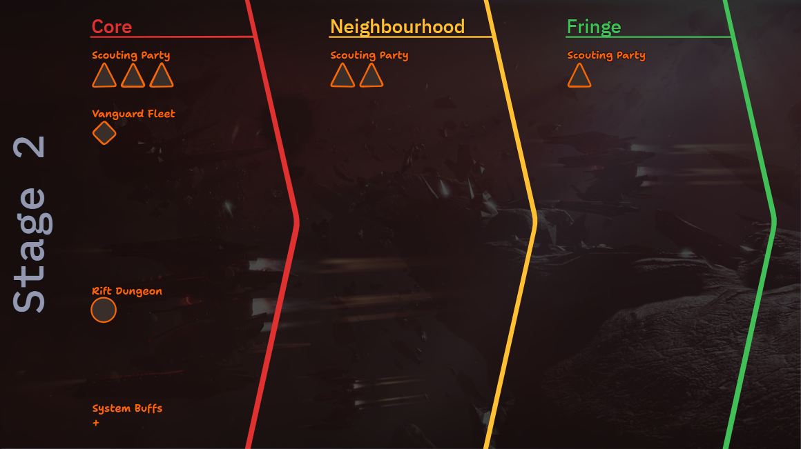Following a series of selection criteria, a solar system was targeted for invasion content. As this content was completed, it progressed through a series of escalating phases. Each phase increased the intensity of content available, applied system-wide buffs and de-buffs to players, but also spread it to the target’s “neighbourhood” and “fringe” (solar systems one and two gate jumps away, respectively). At any given time, there were three active invasion instances, allowing the player community to engage in a sort of “whack-a-mole” as they pushed the beach heads across the New Eden star cluster.