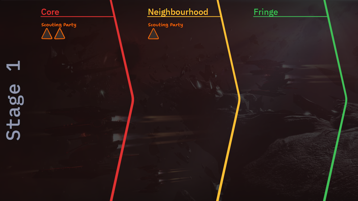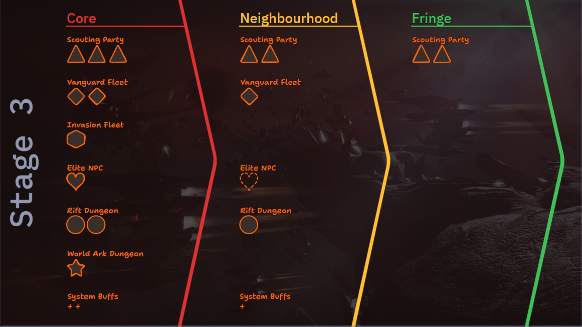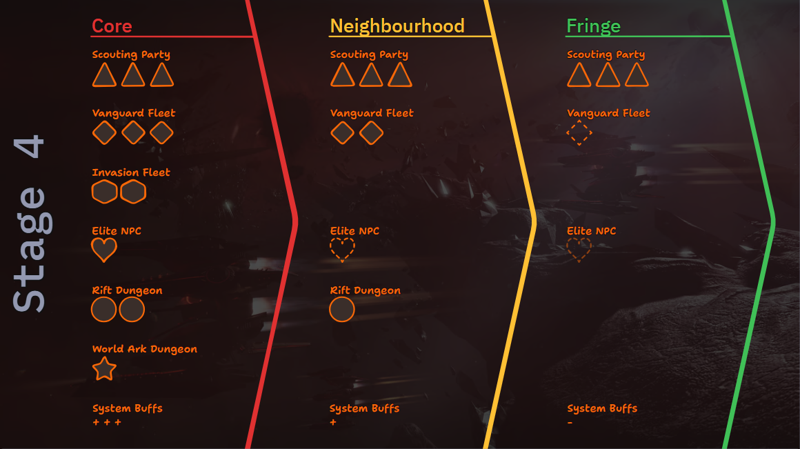 The third and fourth stages marked a progression from scouting parties and strategic prodding to full-scale invasion and war. These were the experiential climax. Escaping content not only increased in number, but difficulty as well, with large amounts of escaping content in the Fringe and Neighbourhood, and sizable Invasion fleets making normal gameplay in the region impossible. These stages also featured the final two content pieces of Invasion: Part 1.