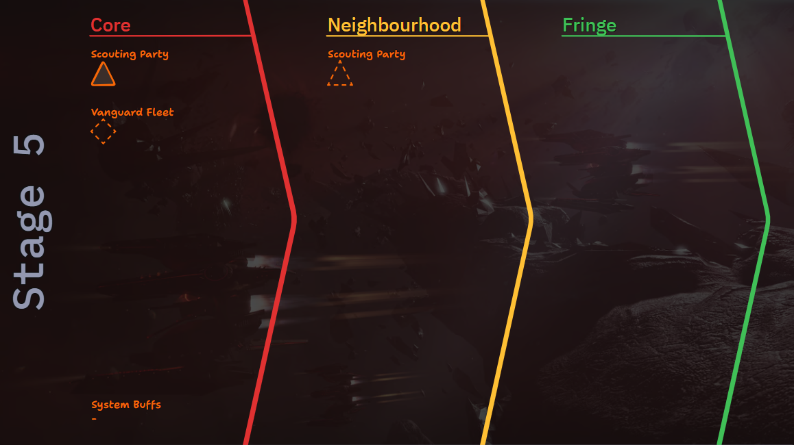 The second phase increased the number of scouts and their reach—spawning them all the way out in fringe systems, where they greatly disrupted merchant vessels autopiloting between markets—and introduced the core Invasion content, including a shift in gameplay balance thanks to system-wide player (and NPC) buffs. Vanguard escaping fleets were significantly more formidable, and featured both crowd control and self-healing mechanics. At this stage players found core invaded systems to be quite dangerous for the unprepared.